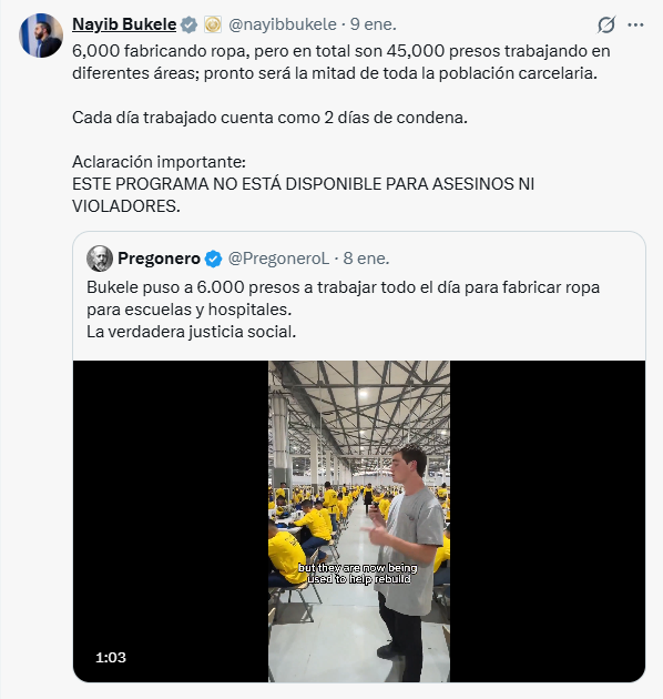 El presidente de El Salvador, Nayib Bukele, ha vuelto a marcar la agenda regional con cifras que demuestran resultados tangibles en su política de seguridad. A través de la red social X, el mandatario informó que 45.000 reclusos se encuentran actualmente trabajando en diversas labores productivas, cifra que se encamina a cubrir el 50% de la población carcelaria del país.