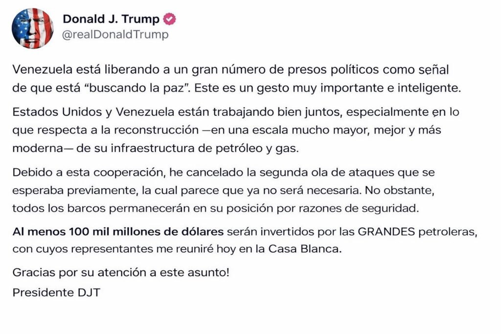 Uno de los puntos más críticos del comunicado es la revelación de que existía una «segunda ola de ataques» planificada contra Venezuela, la cual ha sido cancelada personalmente por Trump debido a los avances en las negociaciones. No obstante, el mensaje fue claro y contundente: aunque la ofensiva se detiene, todos los barcos militares permanecerán en sus posiciones actuales por razones de seguridad, manteniendo una presión latente sobre Miraflores para garantizar el cumplimiento de los acuerdos.