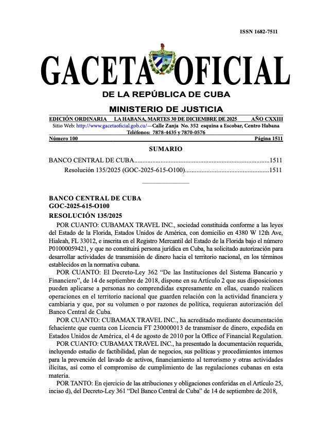 El régimen cubano ha autorizado a la empresa estadounidense Cubamax Travel Inc. a operar en Cuba como transmisora de dinero, incluyendo la posibilidad de entregar dólares en efectivo a los beneficiarios dentro del país. Así lo establece la Resolución 135/2025 del Banco Central de Cuba, publicada en la Gaceta Oficial. La disposición, firmada por la ministra presidenta del BCC, Juana Lilia Delgado Portal, permite a Cubamax canalizar fondos a través de instituciones financieras cubanas para depósitos en cuentas bancarias, tarjetas de débito o prepago, así como la entrega de efectivo tanto en moneda nacional como en divisas. La empresa, con sede en Hialeah, Florida, cuenta con licencia como transmisora de dinero en Estados Unidos y podrá operar en Cuba sin constituirse como persona jurídica, siempre que cumpla con los requisitos de supervisión, transparencia y ciberseguridad exigidos por las autoridades cubanas.