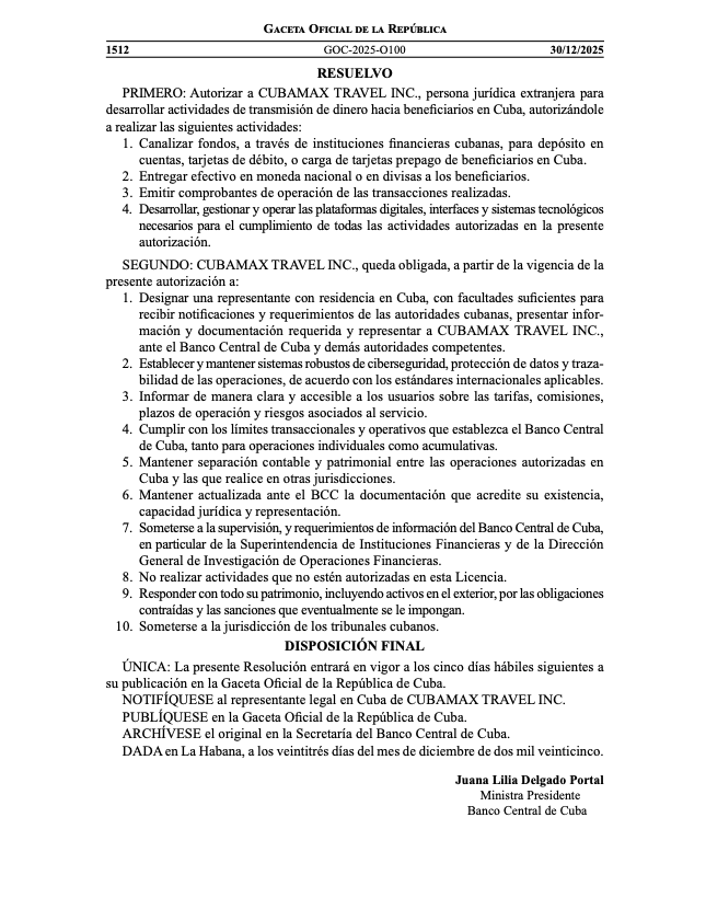 Según la resolución, Cubamax deberá designar un representante residente en Cuba, garantizar sistemas de protección de datos y ciberseguridad, someterse a la jurisdicción de los tribunales cubanos e informar a los usuarios sobre tarifas, comisiones y riesgos. En la práctica, todo el proceso quedará bajo estricto control estatal.