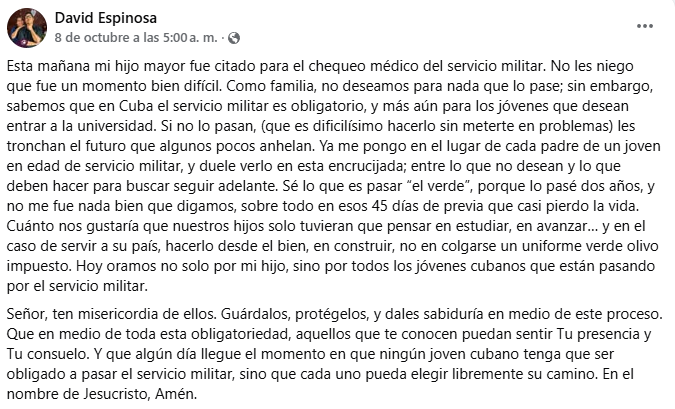 Redacción Reporte Cuba Ya. – «Que algún día llegue el momento en que ningún joven cubano tenga que ser obligado a pasar el servicio militar». Esta frase, cargada de la angustia y la esperanza de un padre, forma parte de una publicación de David Espinosa que ha calado hondo en la conciencia colectiva cubana. Su texto, compartido en redes sociales, narra el difícil momento familiar que atraviesan tras la citación de su hijo mayor para el chequeo médico del Servicio Militar Activo (SMA), reabriendo el debate sobre la pertinencia y la humanidad de esta ley.