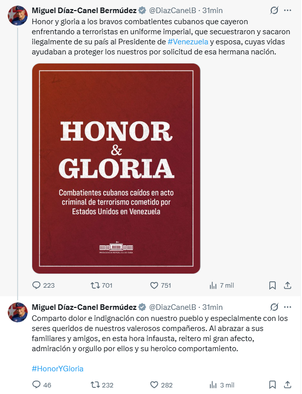 A través de una serie de publicaciones en la red social X, Díaz-Canel lamentó el fallecimiento de los que llamó «bravos combatientes», asegurando que cayeron enfrentando a «terroristas en uniforme imperial». El uso de este lenguaje busca ideologizar un conflicto en el que Cuba ha participado activamente, aunque hasta ahora, bajo un manto de discreción. Según el mandatario, el objetivo de la operación estadounidense fue «secuestrar» al líder venezolano, un eufemismo para describir lo que parece haber sido una operación de captura de alto perfil por parte de Washington.