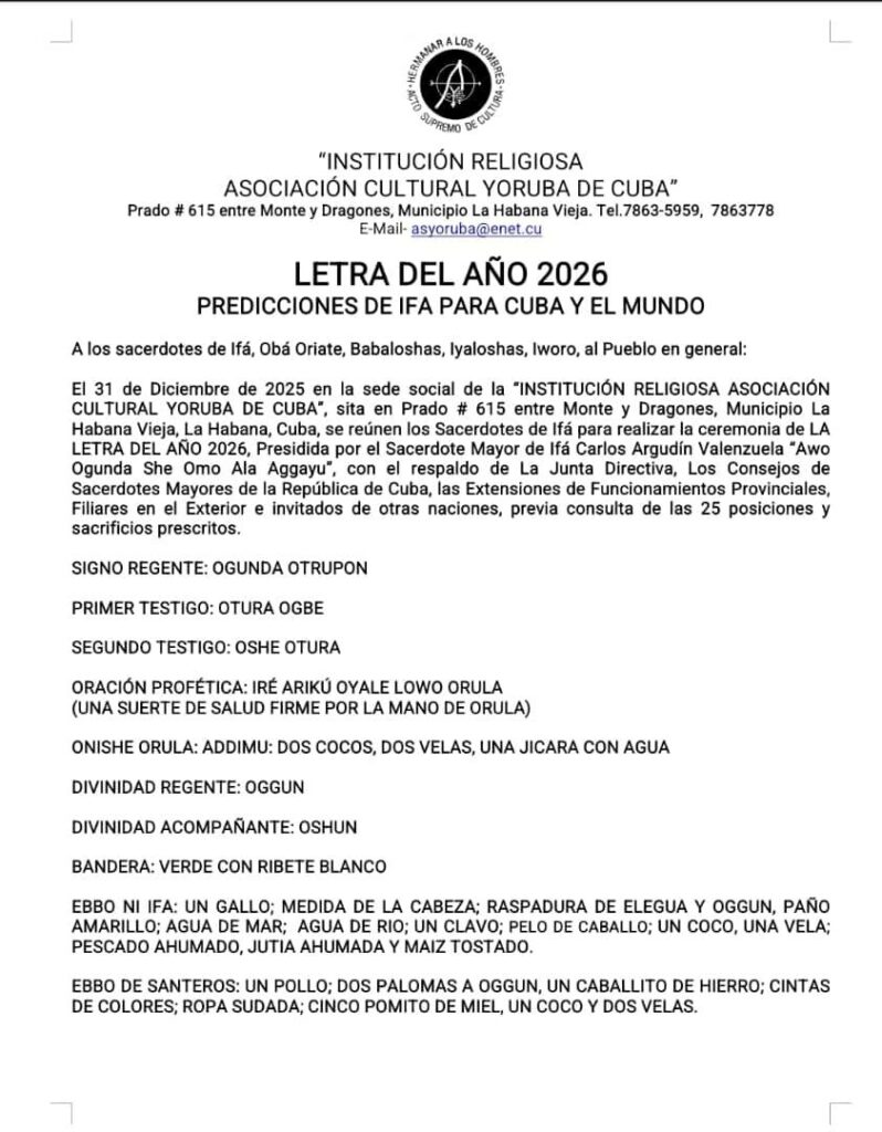 La espera ha terminado para la comunidad religiosa y para gran parte del pueblo cubano que, creyente o no, busca en la Letra del Año una brújula para navegar la difícil realidad de la isla. La «Institución Religiosa Asociación Cultural Yoruba de Cuba» ha hecho públicas sus predicciones para el 2026, un documento que, bajo la lupa del análisis social, revela un panorama de resistencia, tensiones y desafíos de salud.