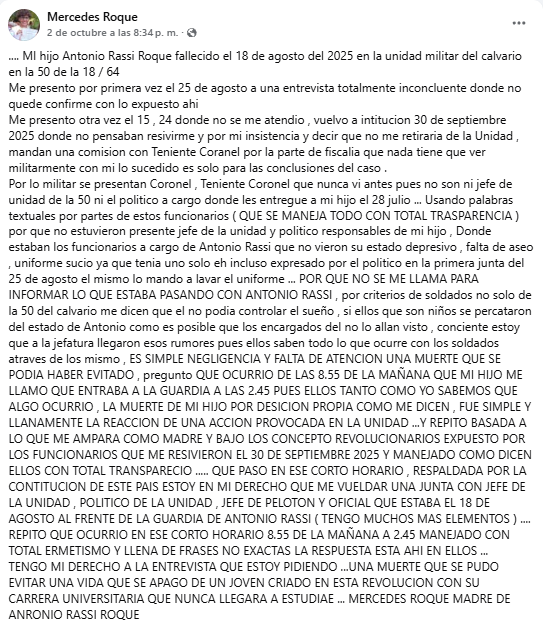La principal acusación de la madre se centra en la visible falta de atención al estado de su hijo. Antonio Rassi, según relata, mostraba signos evidentes de depresión, falta de aseo y descuido en su único uniforme. Estos detalles no solo eran conocidos por la familia, sino que, según testimonios de otros soldados, su incapacidad para controlar el sueño era notoria. «Si ellos que son niños se percataron del estado de Antonio, ¿cómo es posible que los encargados de él no lo hayan visto?», cuestiona Mercedes Roque, apuntando directamente a la cadena de mando.